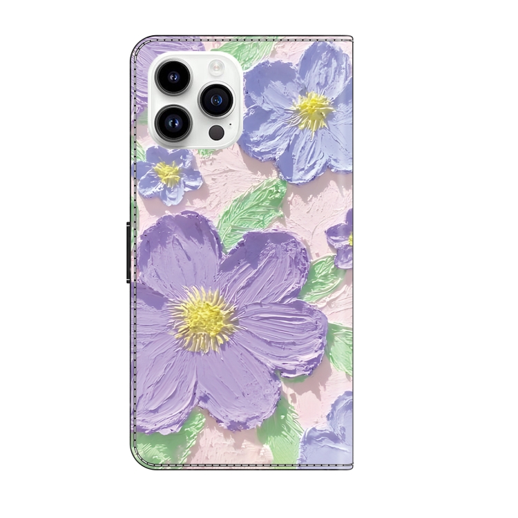 Funda de Cuero para iPhone 16 Pro Pintada al Óleo con Flores Moradas
