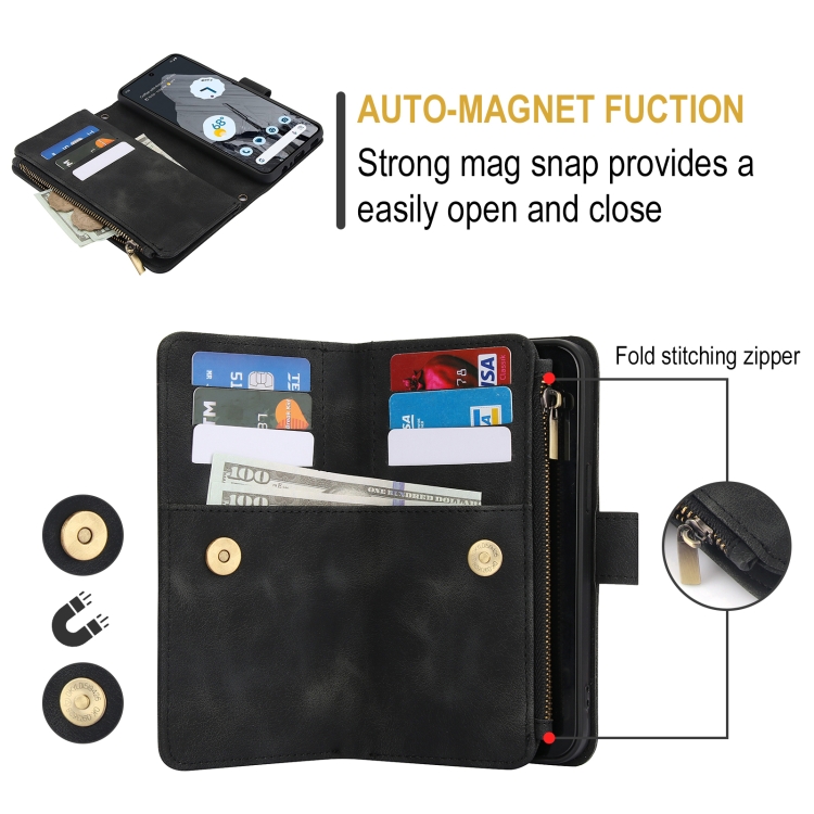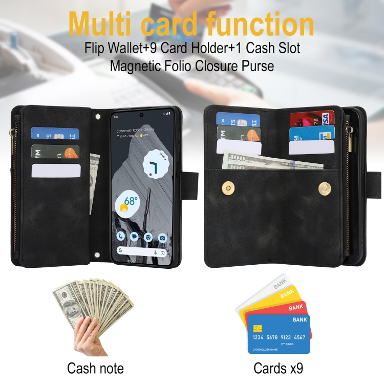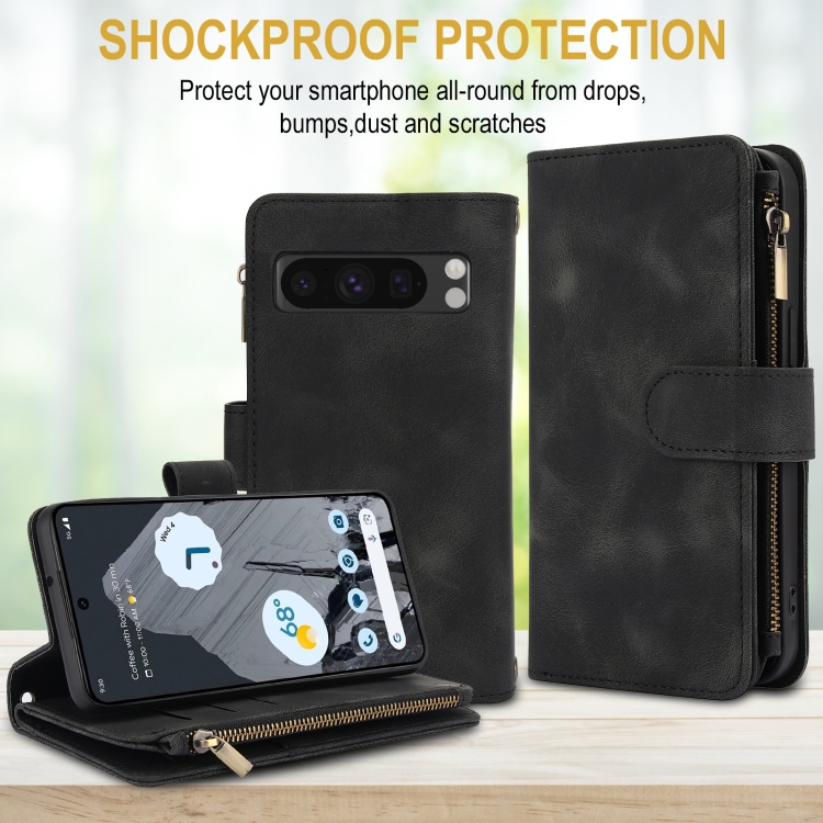 Funda de Cuero Rfid con Cremallera para Google Pixel 8 Pro Dream con 9 Tarjetas y Cordón (Negro)