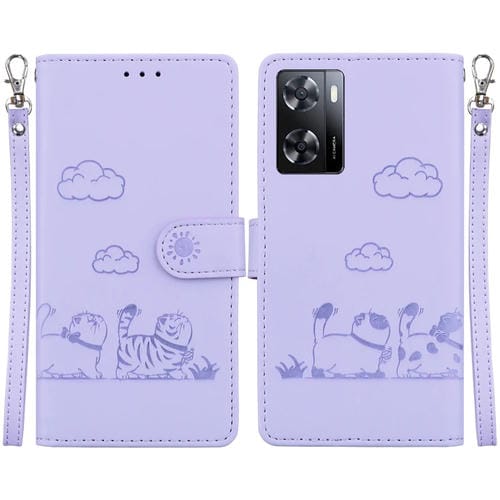 Funda de Cuero Rfid con Diseño de Gatos para Oppo A57 5G / A77 5G (Morada)
