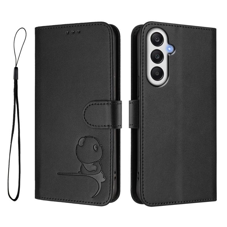 Funda de cuero RFID con estampado de panda y cordón para Samsung Galaxy A05s 4G / F14 4G (negra)