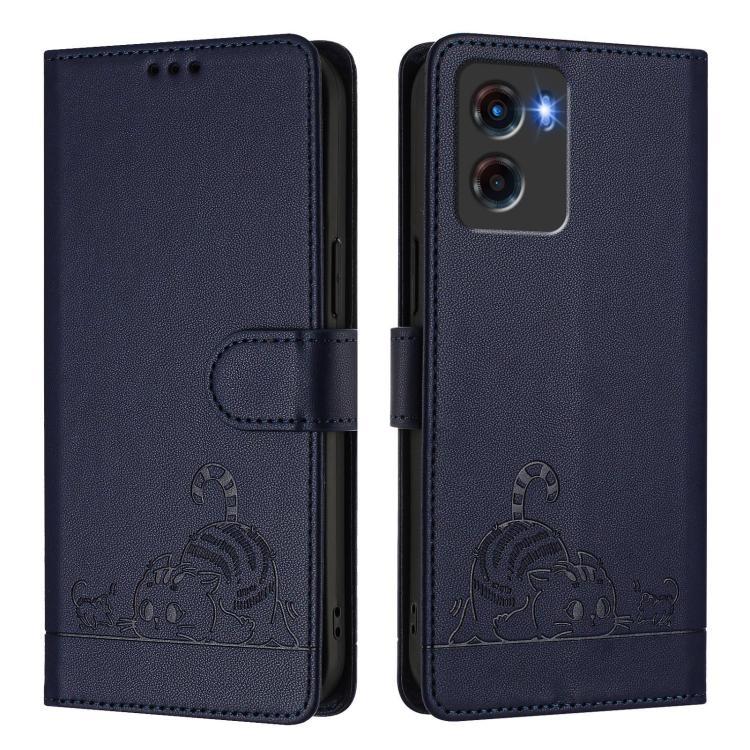 Funda de Cuero Rfid Motorola Moto G05 con Estampado de Rata y Gato en Relieve y Cordón (Azul)