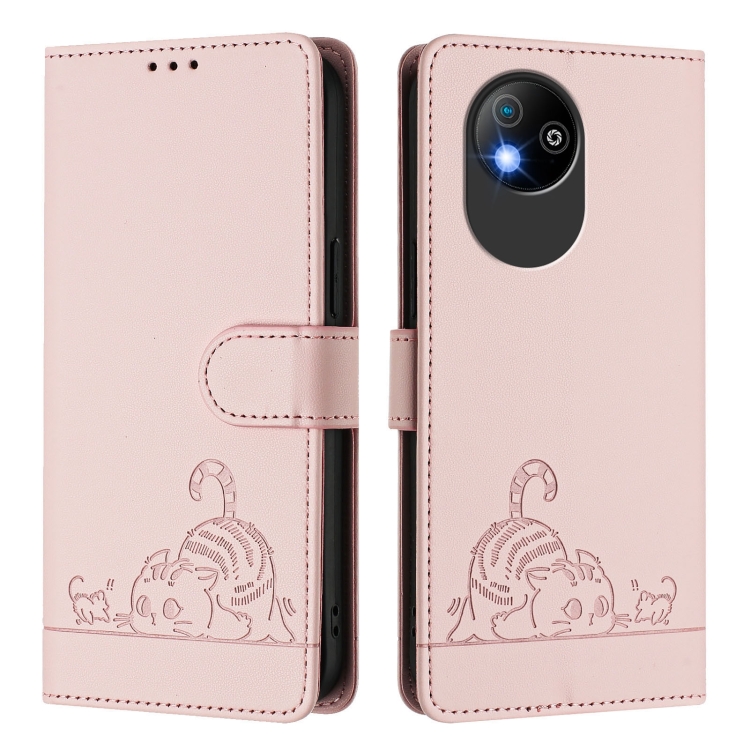 Funda de Cuero Rfid para ZTE Blade A35 Lite con Estampado de Rata y Gato En Relieve y Cordón (Rosa)