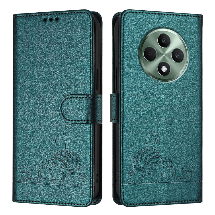 Funda de Cuero Rfid con Estampado de Rata y Gato para Oppo Reno12 F Global con Cordón (Verde Pavo Real)