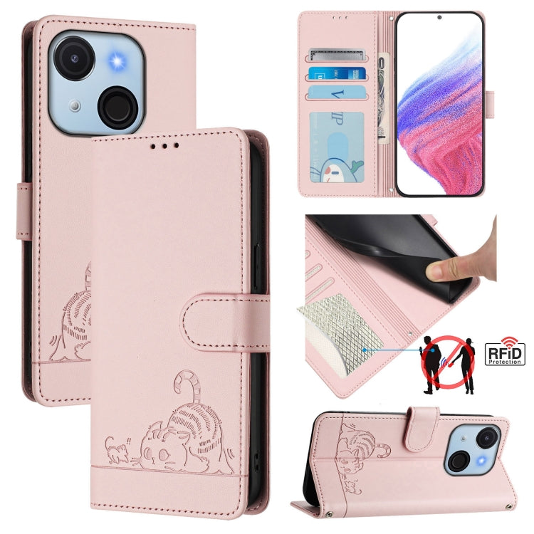 Funda de Cuero Rfid para Teléfono Itel A50C con Estampado de Rata y Gato y Cordón (Rosa)