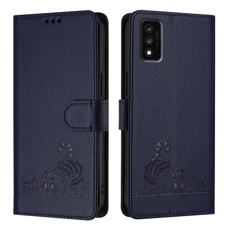 Funda de Cuero Rfid para TCL 30T T603Dl con Patrón En Relieve de Gato y Rata y Cordón (Azul)