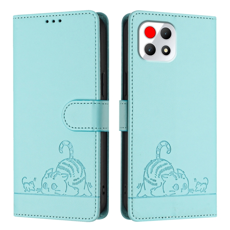Funda de Cuero Rfid con Relieve de Rata y Gato para T-Mobile Revvl 7 5G con Cordón (Verde Menta)