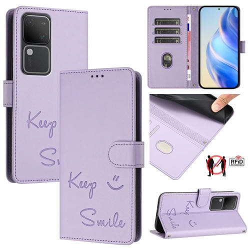 Funda de Cuero Rfid con Relieve de Sonrisa Global para Vivo V30 5G (Morado Claro)
