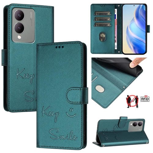 Funda de Cuero Rfid con Relieve de Sonrisa India para Vivo Y17S 5G (Verde Pavo Real)
