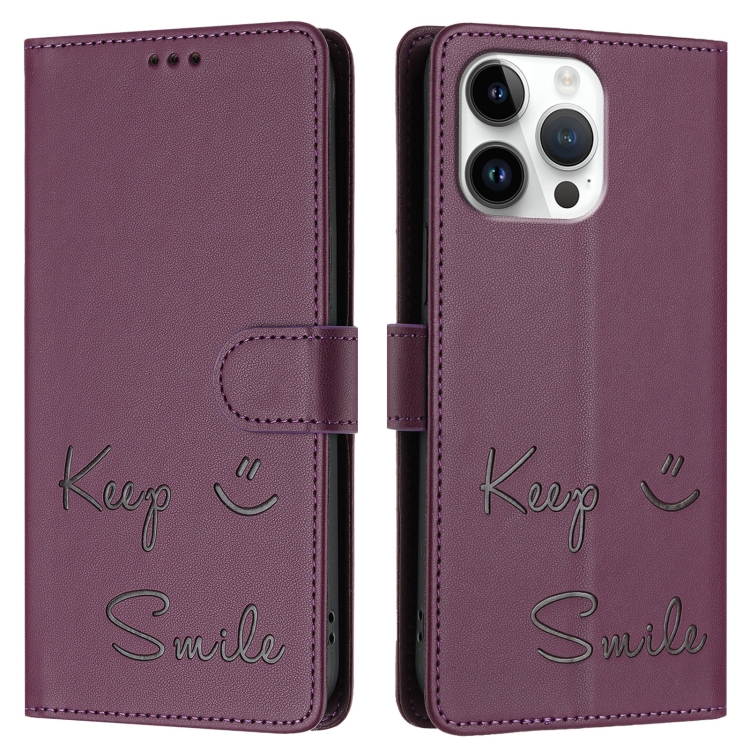 Funda de Cuero Rfid para iPhone 16 Pro Max con Relieve de Sonrisa (Violeta)