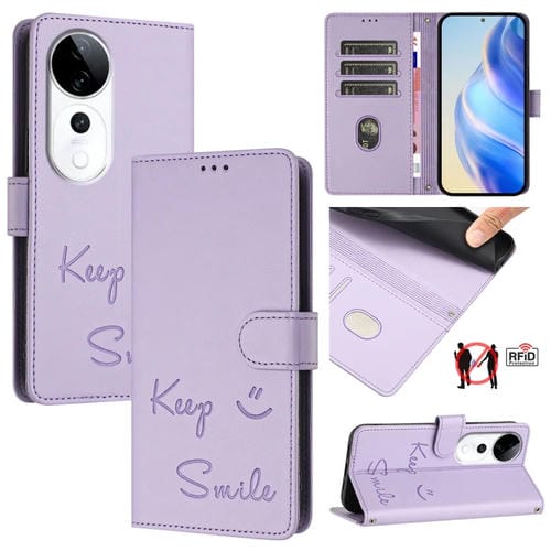 Funda de Cuero Rfid con Relieve de Sonrisa para Teléfono Vivo S19 Pro (Morado Claro)