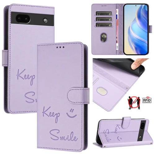 Funda de Cuero Rfid con Relieve Sonriente para Google Pixel 6A (Morado Claro)