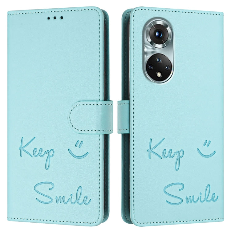 Funda de Cuero Rfid con Relieve Sonriente para Huawei Nova 9 Pro (Verde Menta)