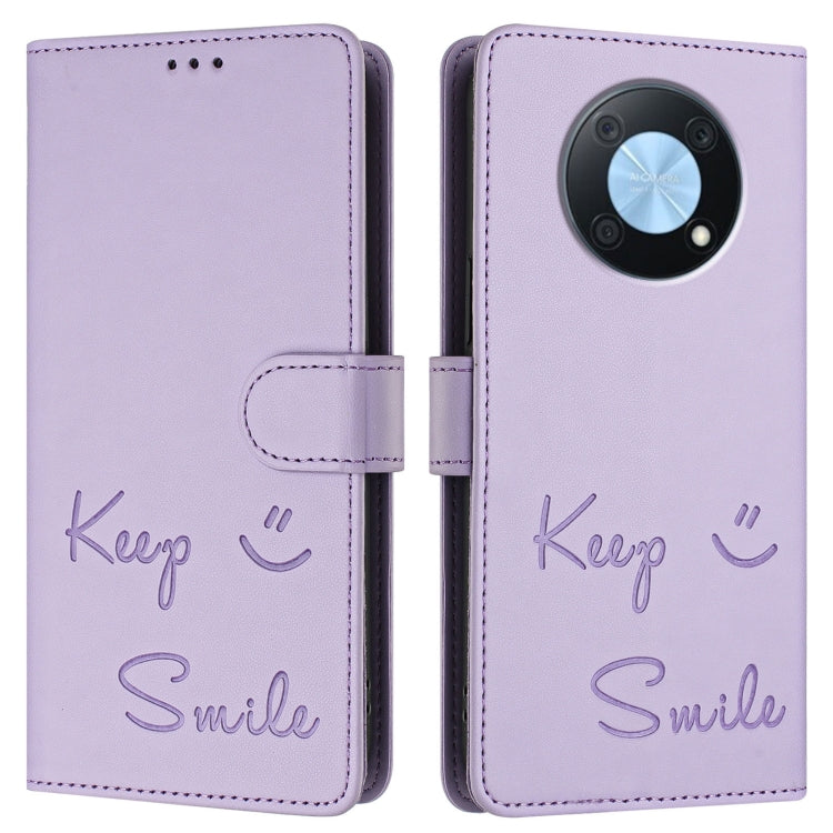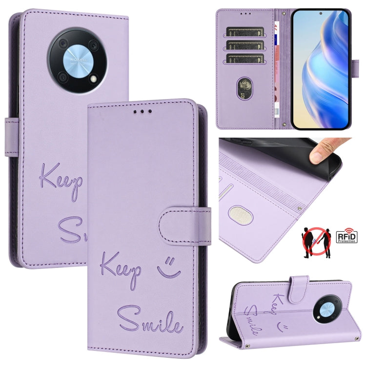 Funda de Cuero Rfid con Relieve Sonriente para Huawei Nova Y90 (Morado Claro)