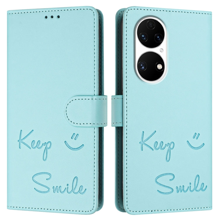 Funda de Cuero Rfid con Relieve Sonriente para Huawei P50 Pro (Verde Menta)