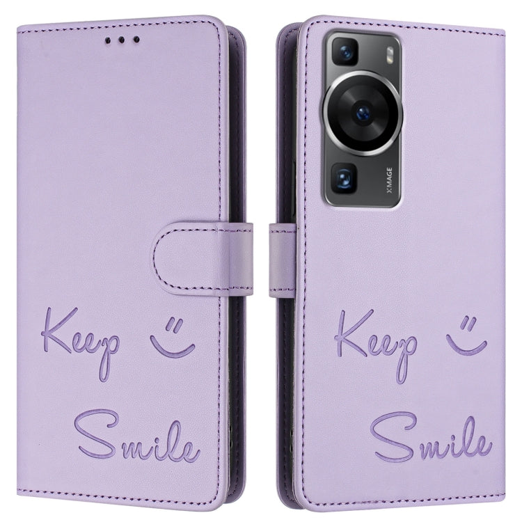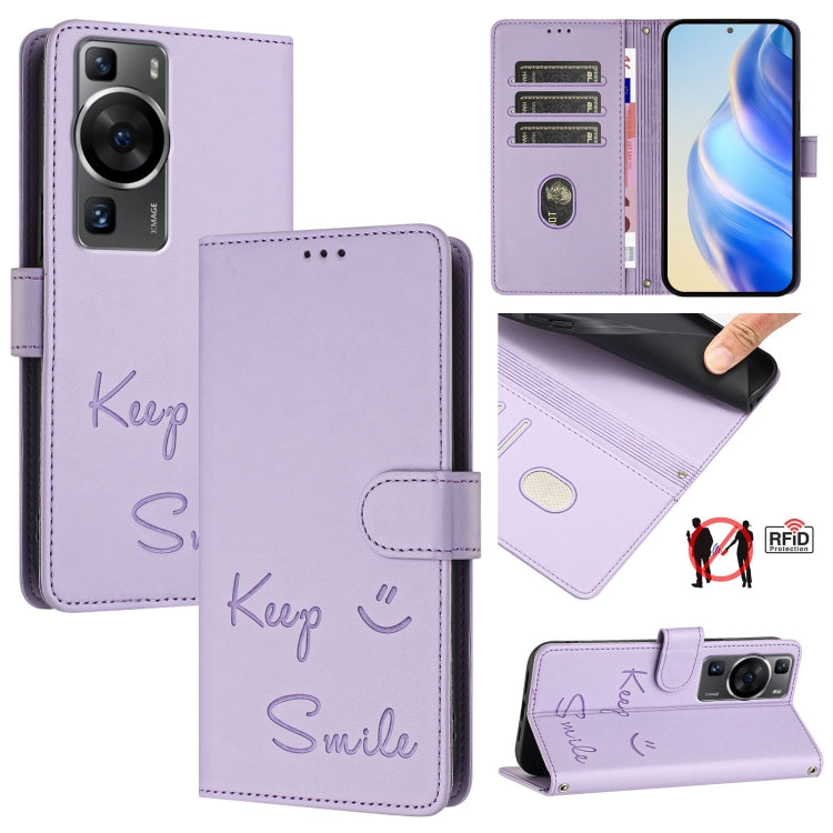 Funda de Cuero Rfid con Relieve Sonriente para Huawei P60/P60 Pro (Morado Claro)