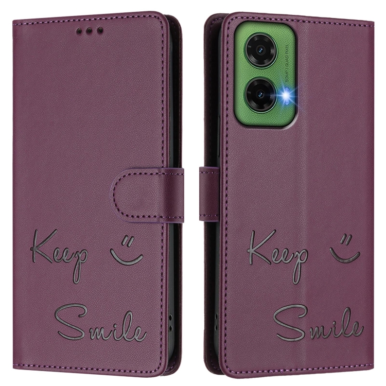 Funda de Cuero Rfid para Motorola Moto G35 con Relieve Sonriente (Violeta)