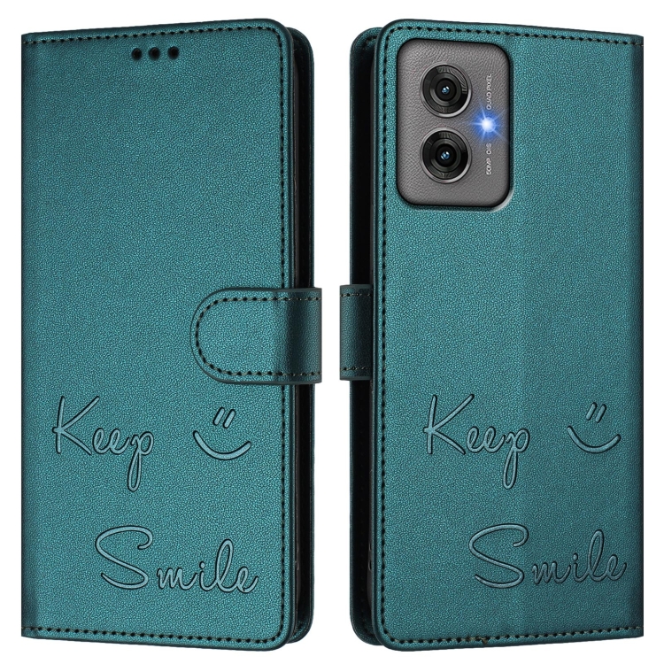 Funda de Cuero Rfid para Motorola Moto G55 con Relieve Sonriente (Verde Pavo Real)