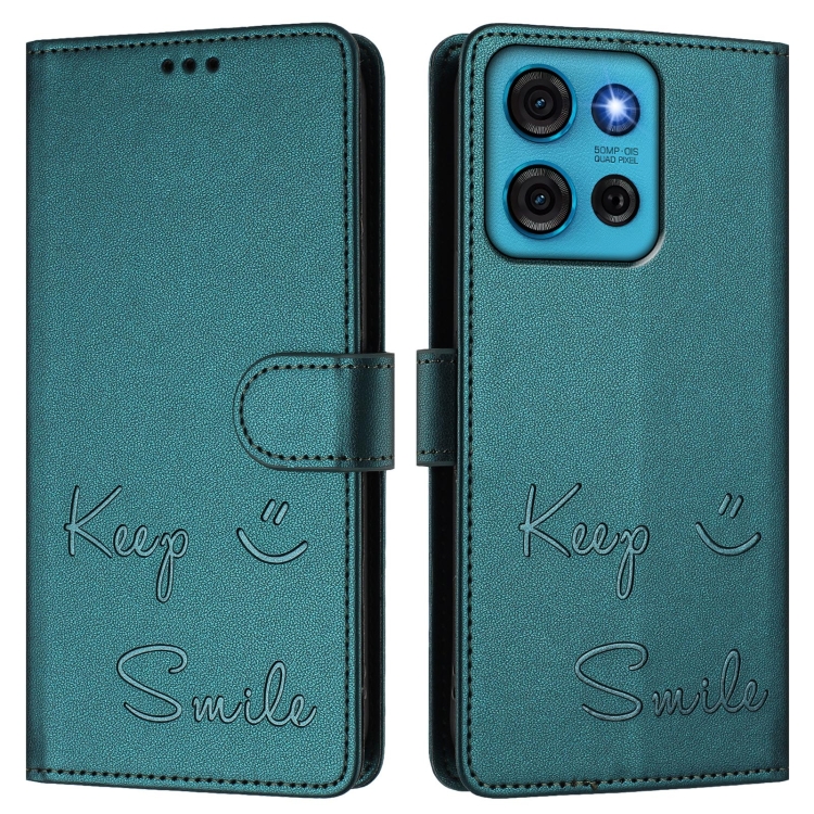 Funda de Cuero Rfid con Relieve Sonriente para Motorola Moto G75 5G (Verde Pavo Real)
