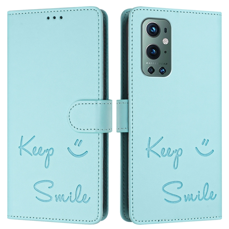 Funda de Cuero Rfid con Relieve Sonriente para OnePlus 9 Pro (Verde Menta)