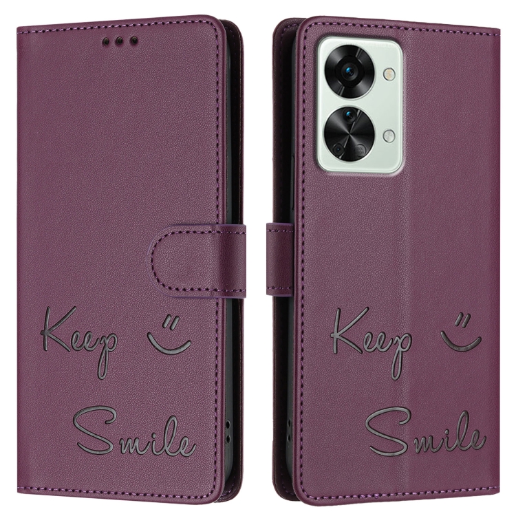 Funda de Cuero Rfid con Relieve Sonriente para OnePlus Nord 2T (Violeta)