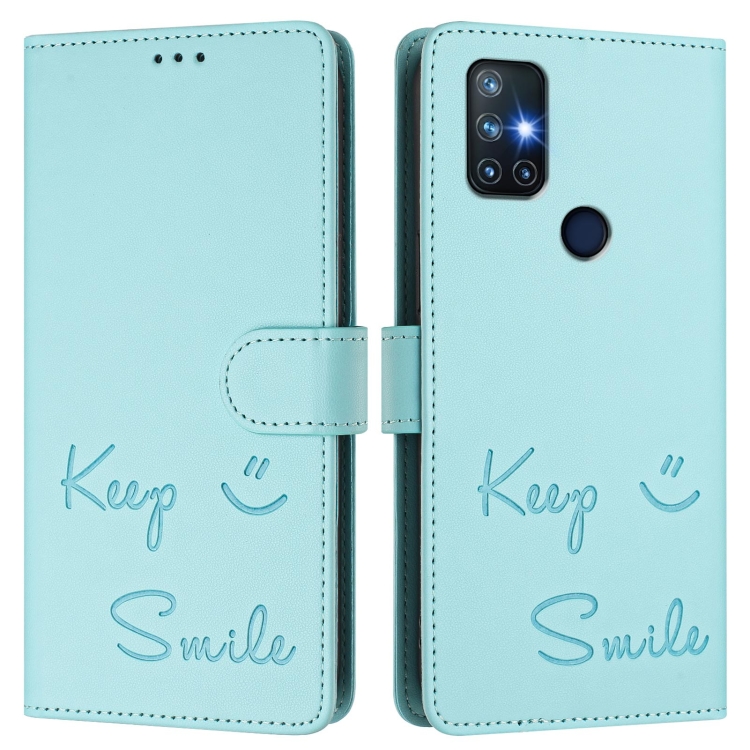 Funda de Cuero Rfid con Relieve Sonriente para OnePlus Nord N10 5G (Verde Menta)