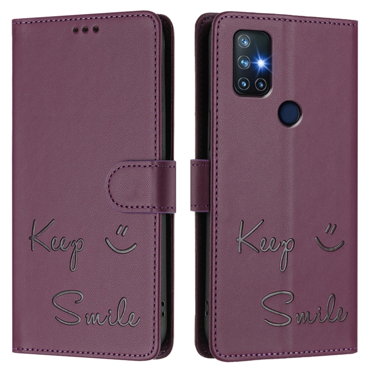 Funda de Cuero Rfid con Relieve Sonriente para OnePlus Nord N10 5G (Violeta)