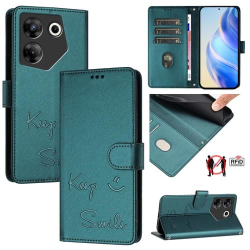 Funda de Cuero Rfid con Relieve Sonriente para Tecno Camon 20 Pro 5G (Verde Pavo Real)
