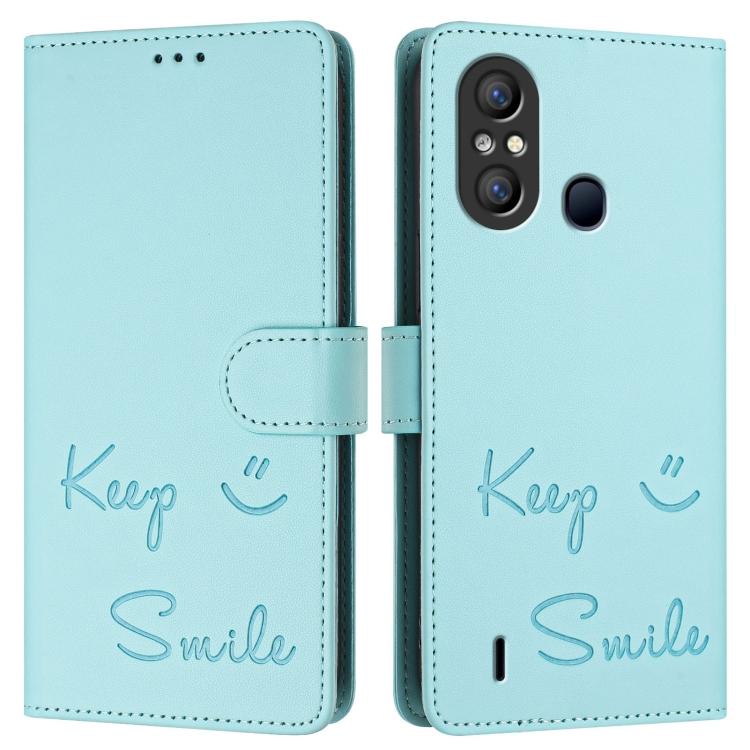 Funda de Cuero Rfid con Relieve Sonriente para Teléfono Itel A58/A49 (Verde Menta)