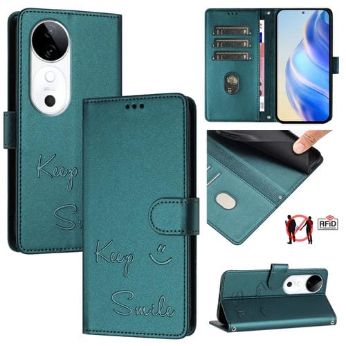 Funda de Cuero Rfid con Relieve Sonriente para Teléfono Vivo S19 (Verde Pavo Real)
