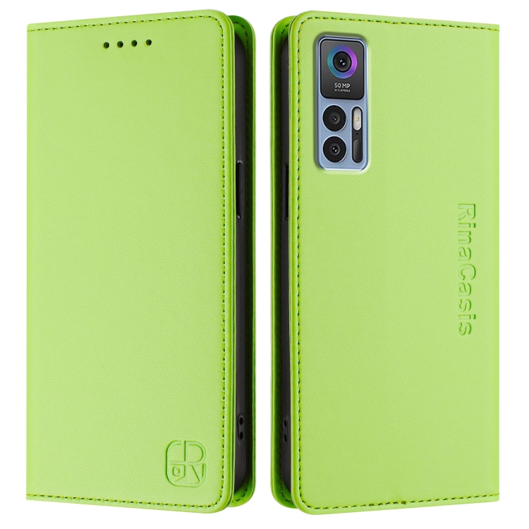 Funda de Cuero Rfid para TCL 30 4G/30 5G/30+ Rc01 con Succión Magnética y Doble Pliegue (Verde Hierba)