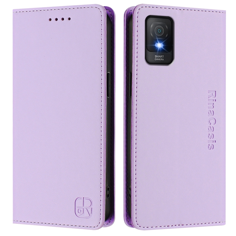Funda de Cuero Rfid para Teléfono TCL 403 Rc01 con Succión Magnética y Doble Pliegue (Morado Claro)