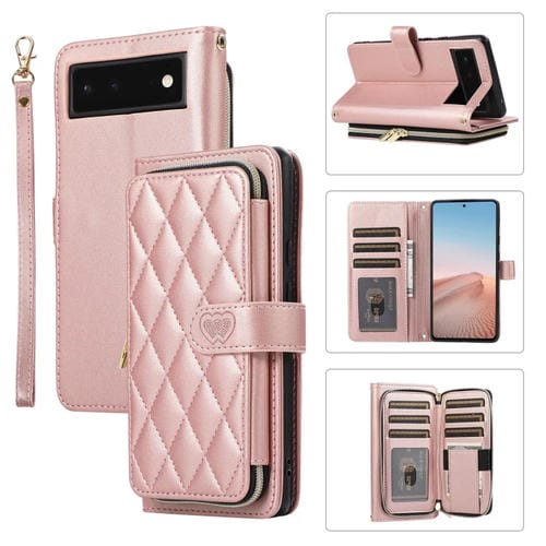 Funda Cuero Tipo Billetera con Cremallera Completa y Diseño Romboidal para Google Pixel 6 (Oro Rosa)