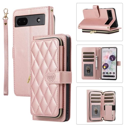 Funda de Cuero Tipo Billetera con Cremallera Completa y Diseño Romboidal para Google Pixel 6A (Oro Rosa)