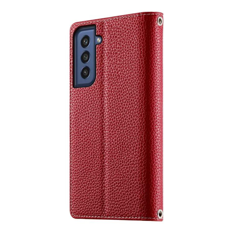 Funda de cuero tipo billetera con cremallera para Samsung Galaxy S21 FE 5G, con costuras, múltiples tarjetas y correa corta (roja)