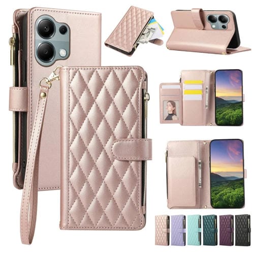 Funda de Cuero Tipo Billetera con Cremallera Rombal para Redmi Note 13 Pro 4G (Oro Rosa)