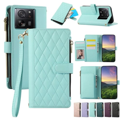 Funda de Cuero Tipo Billetera con Cremallera Rombal para Xiaomi 13T/13T Pro (Cian)