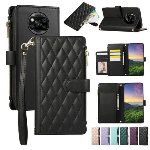 Funda de Cuero Tipo Billetera con Cremallera Rombal para Xiaomi Poco X3 Nfc (Negra)