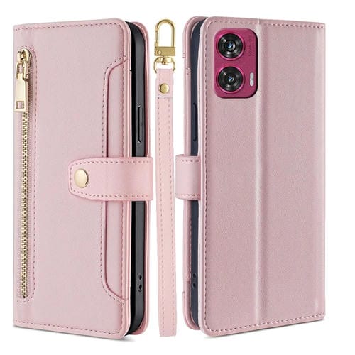 Funda de Cuero tipo Billetera con Cremallera y Textura de Oveja para Motorola Edge 50 Fusion 5G (Rosa)
