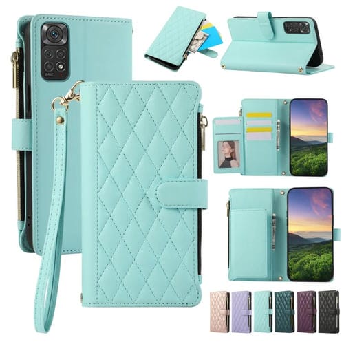 Funda de Cuero Tipo Billetera con Cremallera y Diseño Rombal para Redmi Note 11S (Cian)