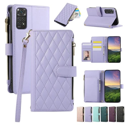 Funda de Cuero Tipo Billetera con Cremallera y Diseño Rombal para Redmi Note 11S (Morado)