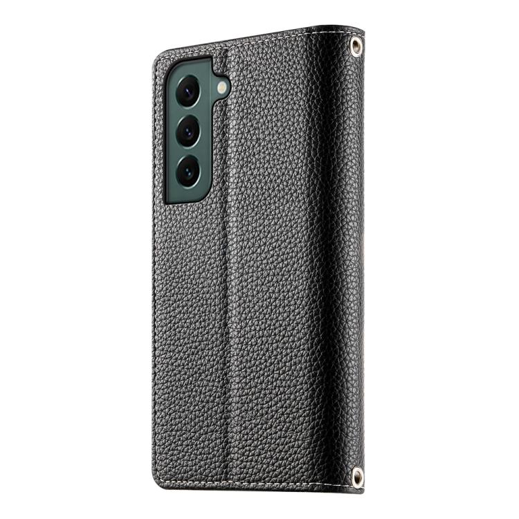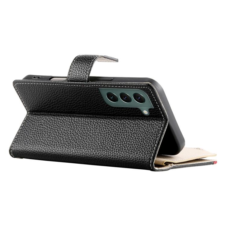 Funda de cuero tipo billetera con cremallera y múltiples tarjetas para Samsung Galaxy S22 5G con costuras y correa corta (negra)