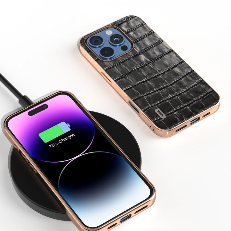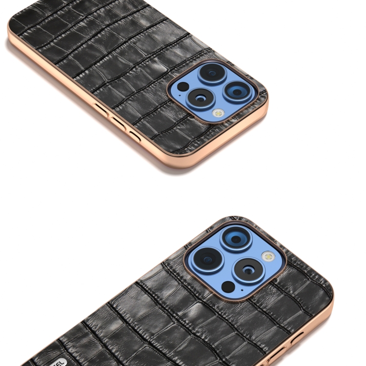 Funda para iPhone 16 Pro Max Abeel Piel Auténtica Textura Cocodrilo Marco Galvanizado (Negro)
