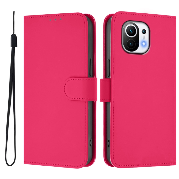 Funda de Piel con Cordón para Teléfono Xiaomi Mi 11 Skin Feel de Color Liso (Rosa Rojo)