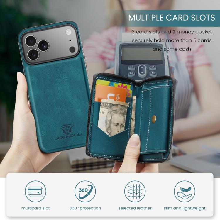 Funda de piel con cremallera magnética horizontal tipo libro JEEHOOD J02 para iPhone 17 Pro (Azul)