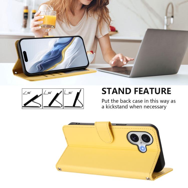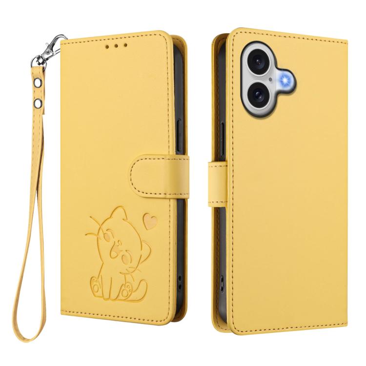 Funda de piel con diseño de gato y corazón en relieve para iPhone 17 con correa de mano (amarilla)