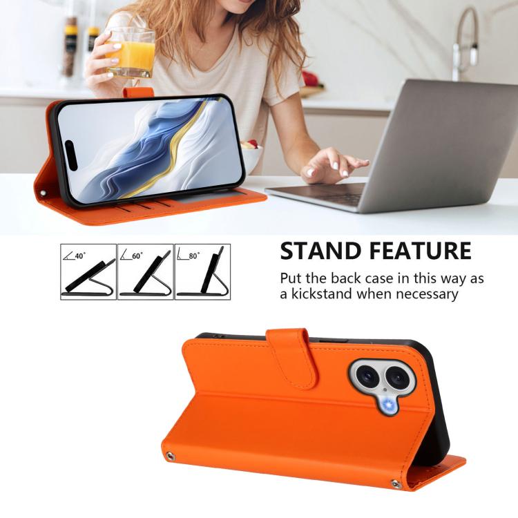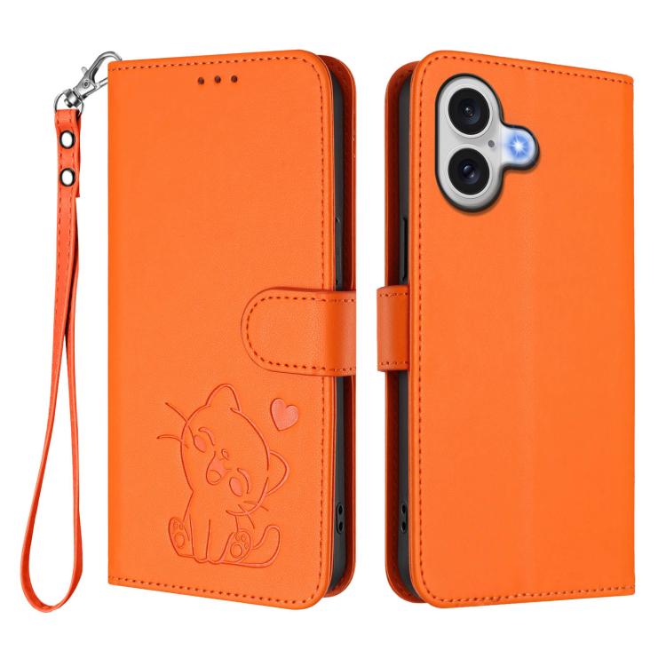 Funda de piel con diseño de gato y corazón en relieve para iPhone 17 con correa de mano (naranja)