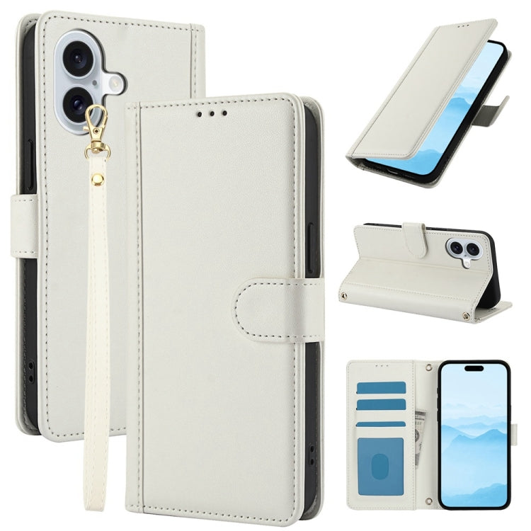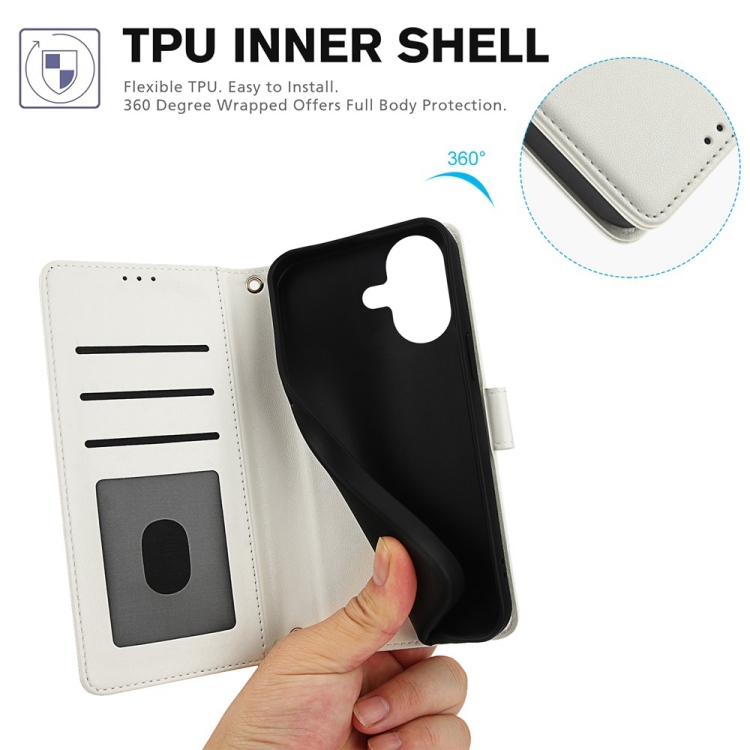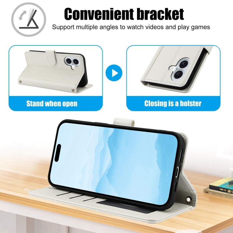 Funda de Piel para iPhone 16 con Ranuras para Tarjetas y Cordón Doble (Blanco)