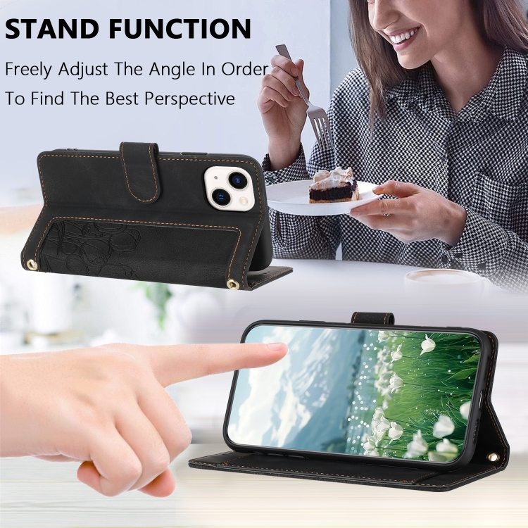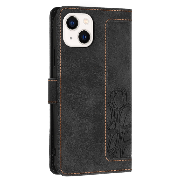Funda de Piel con Relieve de Tulipanes para iPhone 14 con Cordón (Negro)