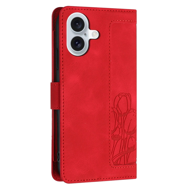 Funda de Piel con Relieve de Tulipanes para iPhone 16 con Cordón (Rojo)