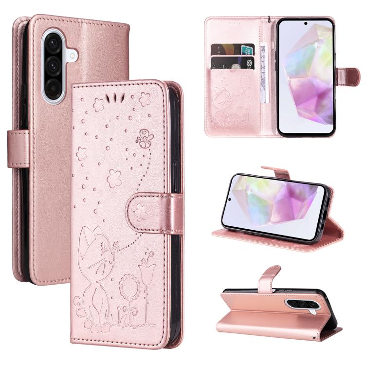 Funda de piel con tapa y diseño de gato y abeja para Samsung Galaxy A36 5G / M56 5G (oro rosa)